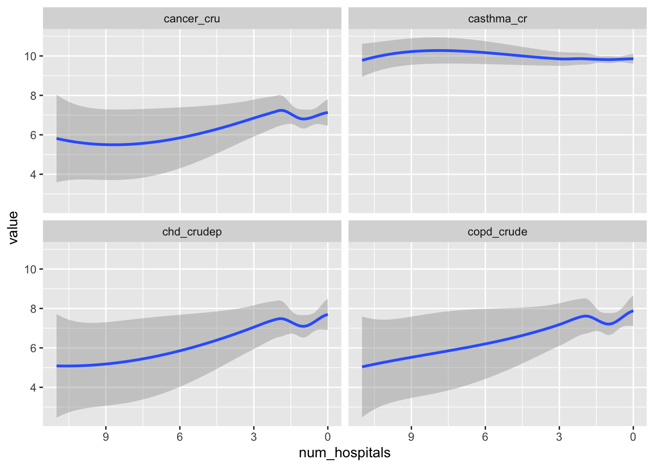 Because both datasets have unique identifiers for county we can use the group_by, summarise routine to calculate the means. We then add a mutate to count the number of hospitals which we get by combining st_intersects (a predicate the returns T/F for each element) with lengths to count the number of TRUE in each call to st_intersects. We plot as before, but use scale_x_reverse (one of many ggplot calls to order, sort, and format the axes) to make these plots reflect something similar to the distance plots above (ie., lower distances to the left should correspond to more hospitals also on the left)