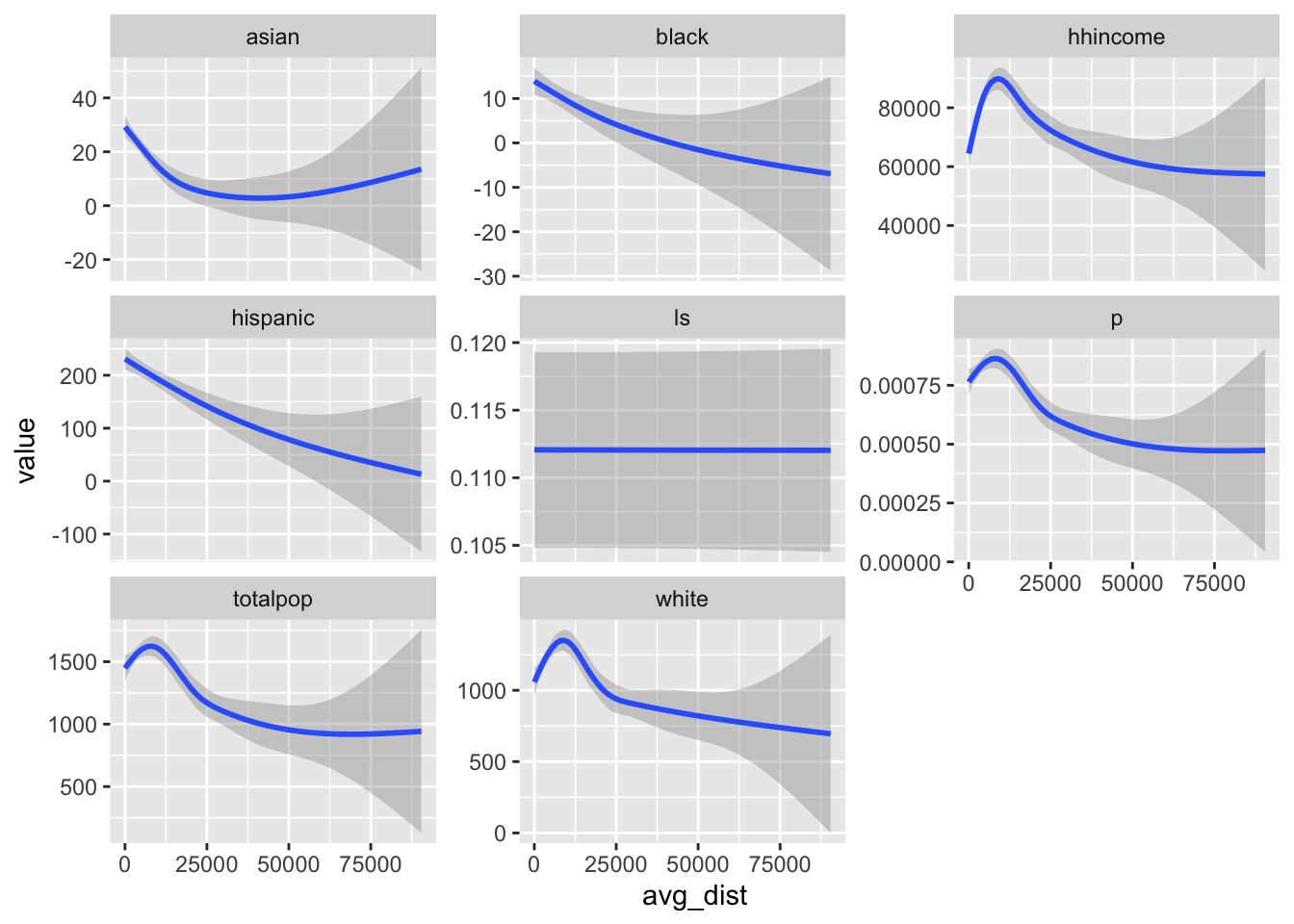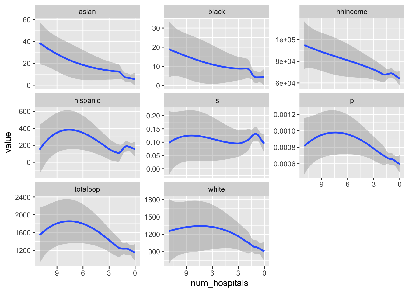 Calculate the average distance between each block group and the nearest hospital. Use ggplot to explore the correlation between census demographics and distance to hospitals.