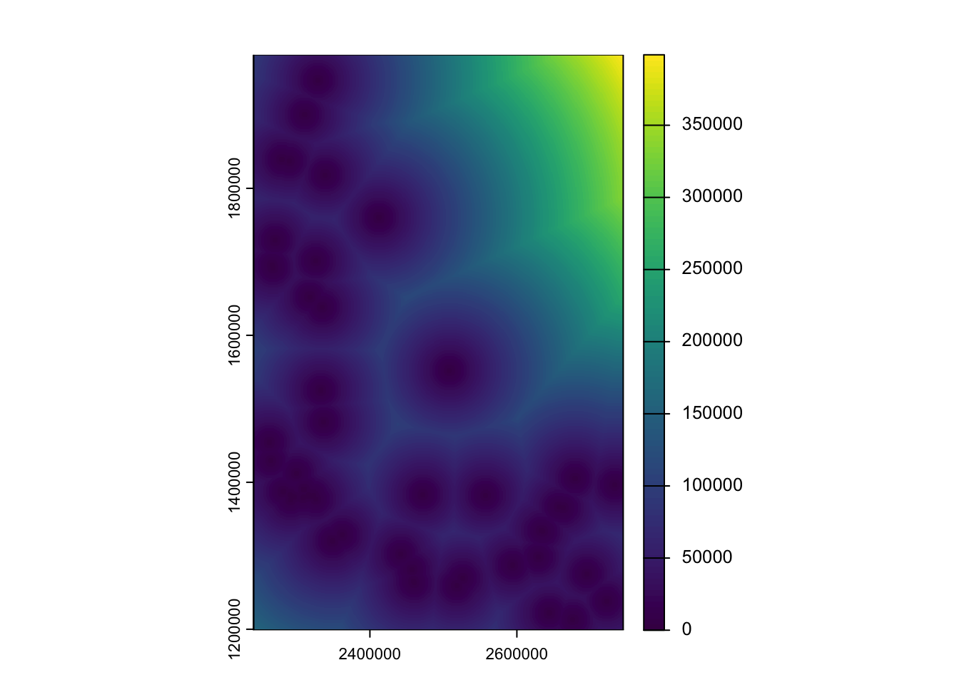 I used the distance function in the terra package because we wanted the average distance in each of the polygon geometries. You might have tried st_distance, but st_distance wouldn’t give us this directly and we wouldn’t be able to deal with the fact that some counties are large enough to have portions that are close to a hospital and portions that are fast. It’s not quite as precise as st_distance, but the difference is negligible here (because we have 1km cells).