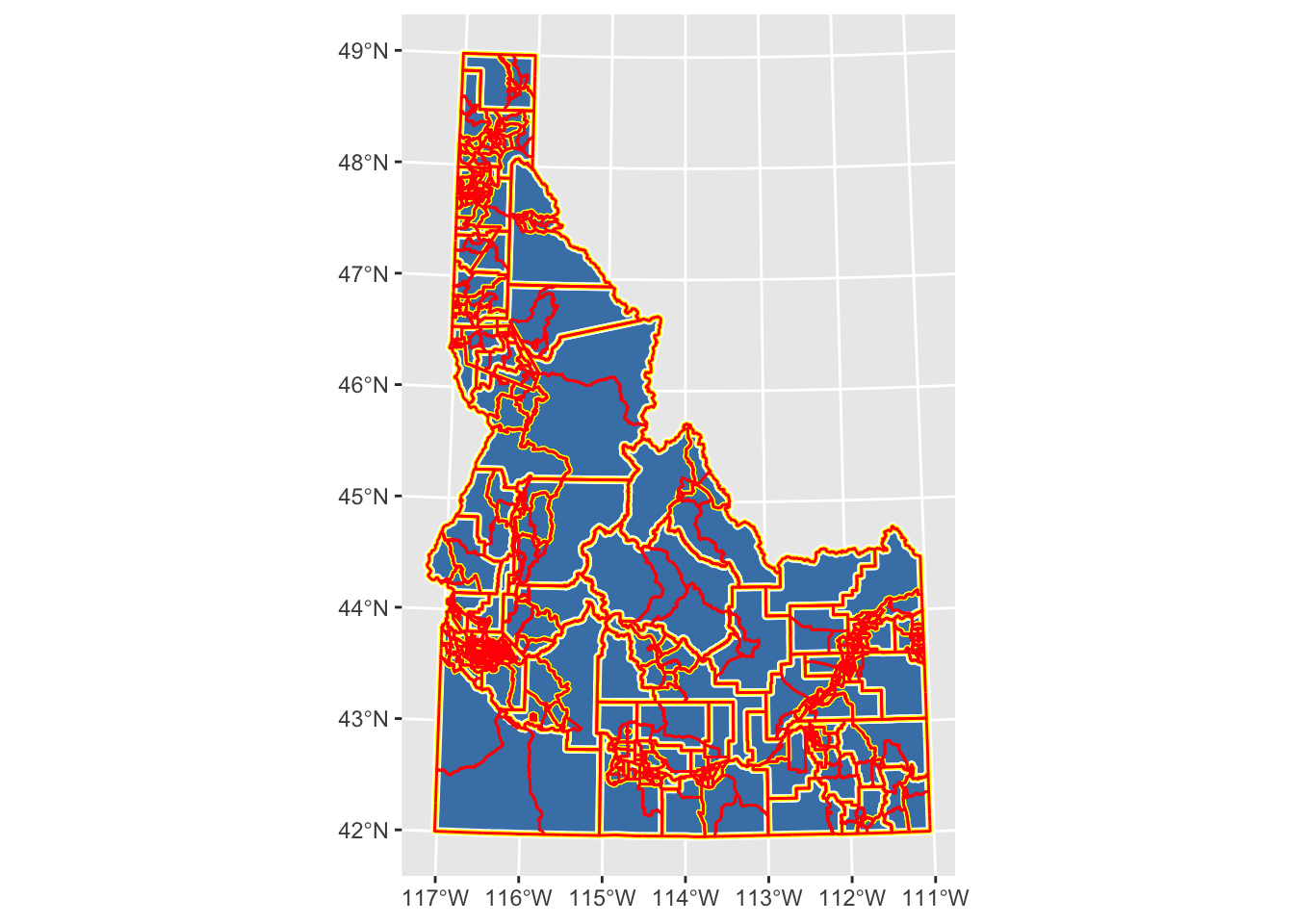 ggplot() +geom_sf(data = id_state, fill ="steelblue") +geom_sf(data = id_counties, fill ="transparent", color ="white", lwd =1.5) +geom_sf(data = id_tracts, fill ="transparent", color ="yellow", lwd =1) +geom_sf(data = id_blockgroup, fill ="transparent", color ="red", lwd =0.5)