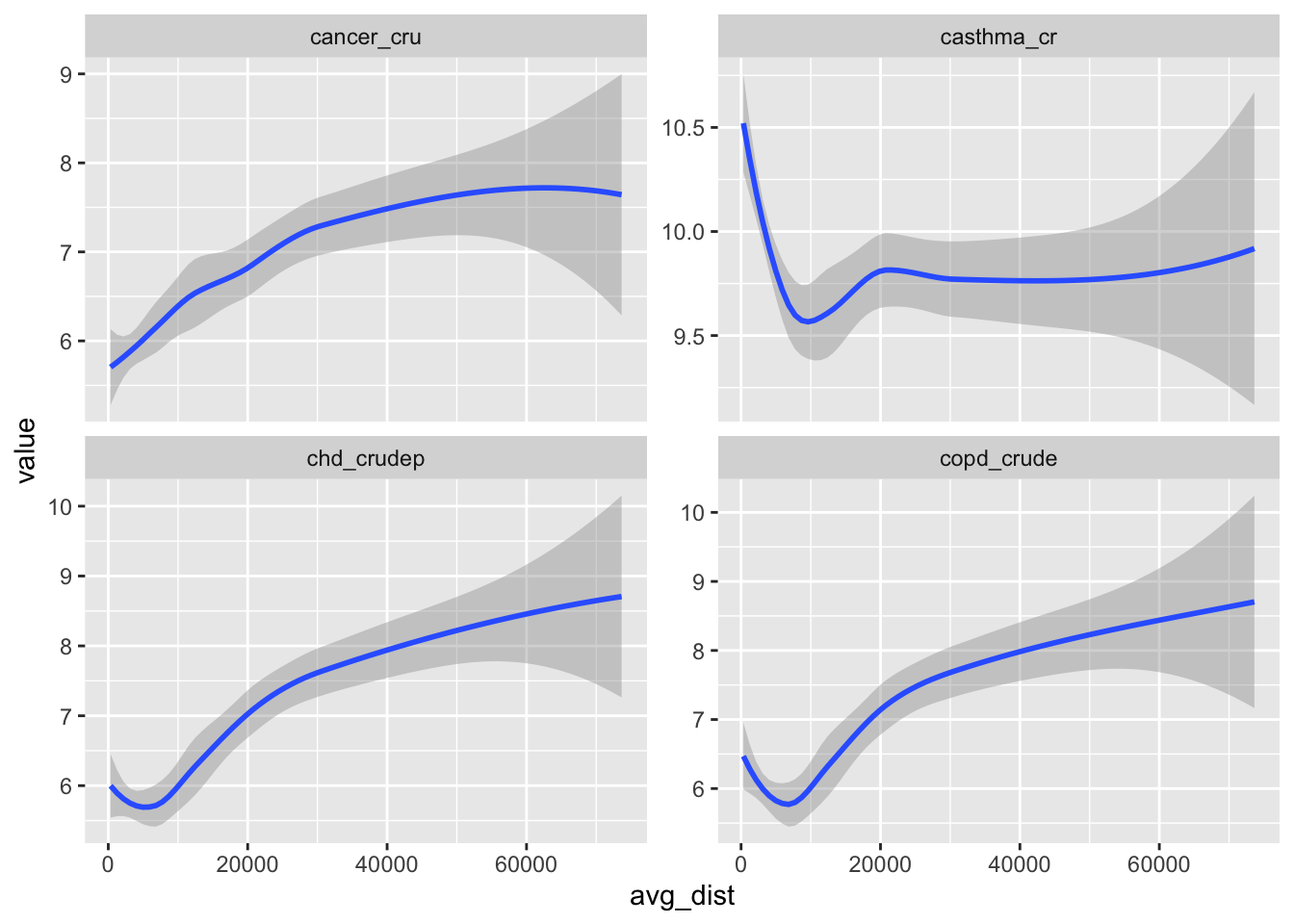 Do the same thing but comparing tract-level distances and 3 health indicators from the CDC data.