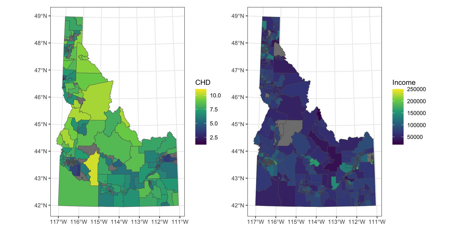 The joins are pretty typical usage of st_join (the spatial join) and left_join (the tabular join). Once the joins are complete, I want to visualize both datasets. I again use geom_sf, but this time I supply a fill argument to the mapping function. This tells ggplot that I want the values for the fill variable to detemine the colormapping that is displayed. Now that I’ve assigned a fill variable, I can provide ggplot with additional info to determine how I want that fill to be scaled. I use scale_fill_viridis because it’s a nice, colorblind-friendly palette that works well for continuous values. By providing a name argument to the scale_fill_viridis call, I am telling ggplot what I want to see printed as the legend label. Lastly, I use theme_bw(), one of ggplot’s built-in theming systems to deal with most of the plot details. The last piece here, and the piece that might be new, is the use of the patchwork package to plot the two maps side-by-side. Patchwork provides a simple interface for making multi-panel plots using mathematical operators (in this case, I’m using + to add the two plots together). The package webpage and helpfile have lots of useful intro for combining plots in a relatively simple way.