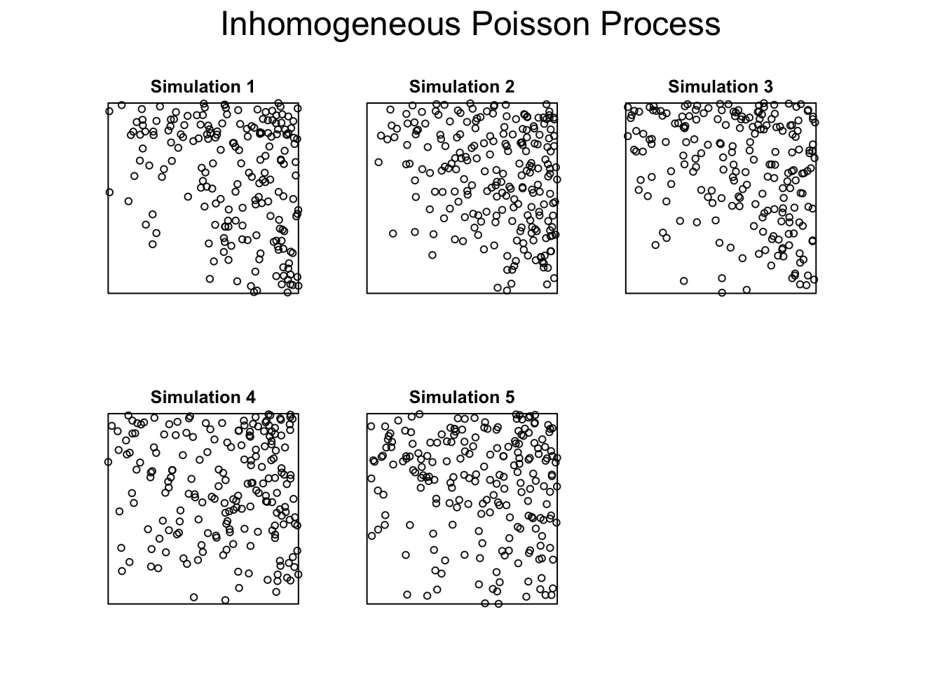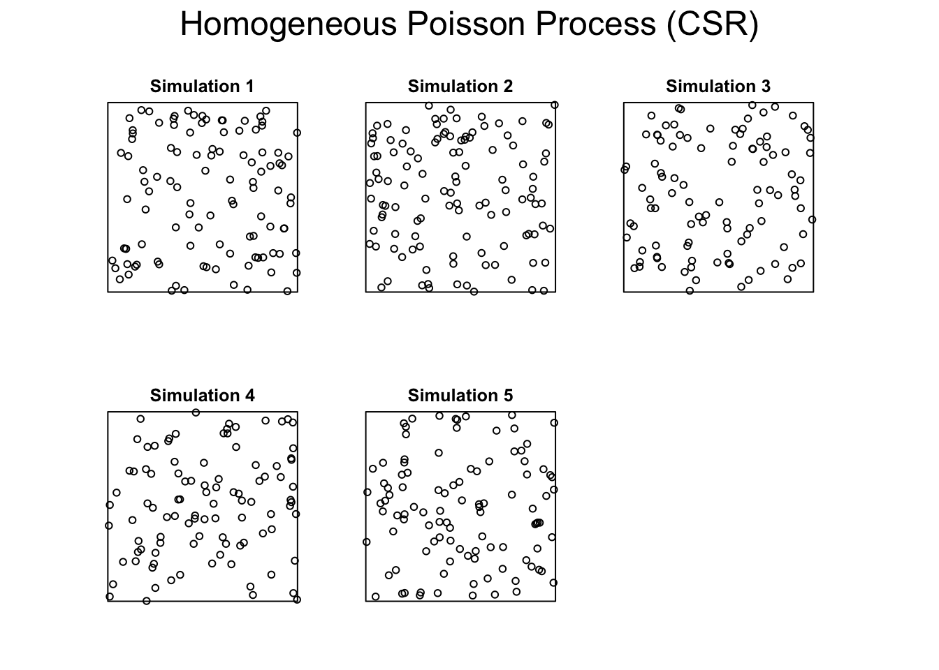 set.seed(2025)W <-owin(c(0,1), c(0,1))hpp <-rpoispp(lambda =100, win = W, nsim =1000)plot(hpp[1:5], main ="Homogeneous Poisson Process (CSR)")