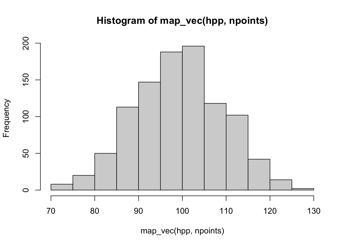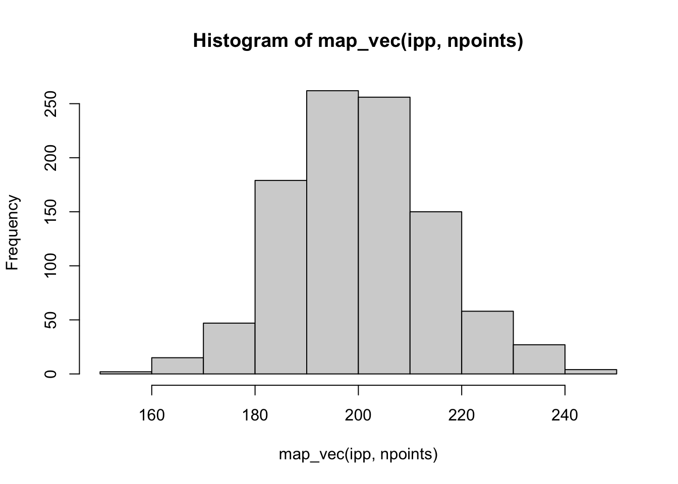 As before, you set the window for the analysis using owin and then use rpoispp to generate the homogeneous Poisson point process with lambda=100. I use map_vec to pass the list of 1000 point processes (generated because I set nsim=1000) to the spatstat function npoints which simply counts the number of points in each ppp object. I used map_vec because I want this collapsed into a vector that I can pass to hist so that you can see that the mean value of the simulations is around 100 and equal to our rate.