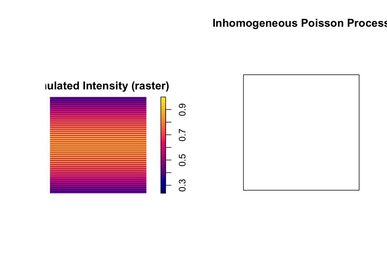 You don’t have to be restricted to (admittedly abstract) functions for generating IPPP. You can also use a raster to depict spatial variation in intensity. You might imagine a situation where you have data on a covariate (like elevation or vegetation type) that you think influences the rate of event occurrenc. I’ll demonstrate that here with a simulated raster: