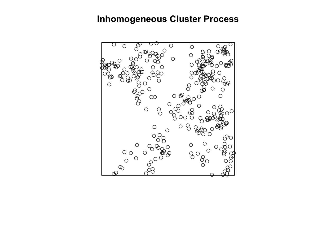 lambda_parent <-function(x, y){ 30* (x + y +0.2) }clustered <-rThomas(kappa = lambda_parent, sigma =0.05, mu =10, win = W)plot(clustered, main ="Inhomogeneous Cluster Process")