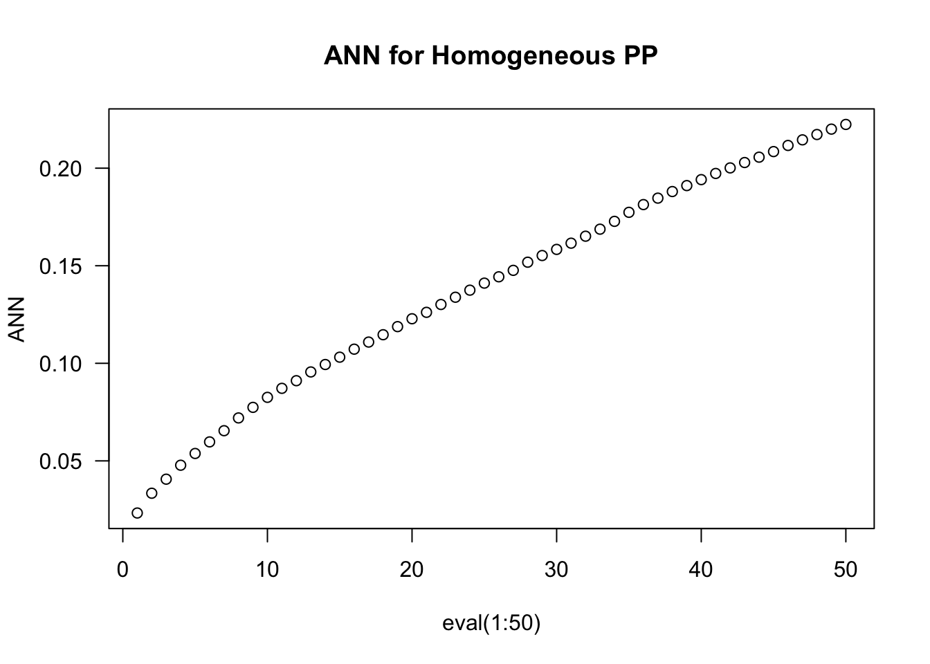 ANN <-apply(nndist(clustered, k=1:50),2,FUN=mean)plot(ANN ~eval(1:50), type="b", las=1, main ="ANN for Homogeneous PP")