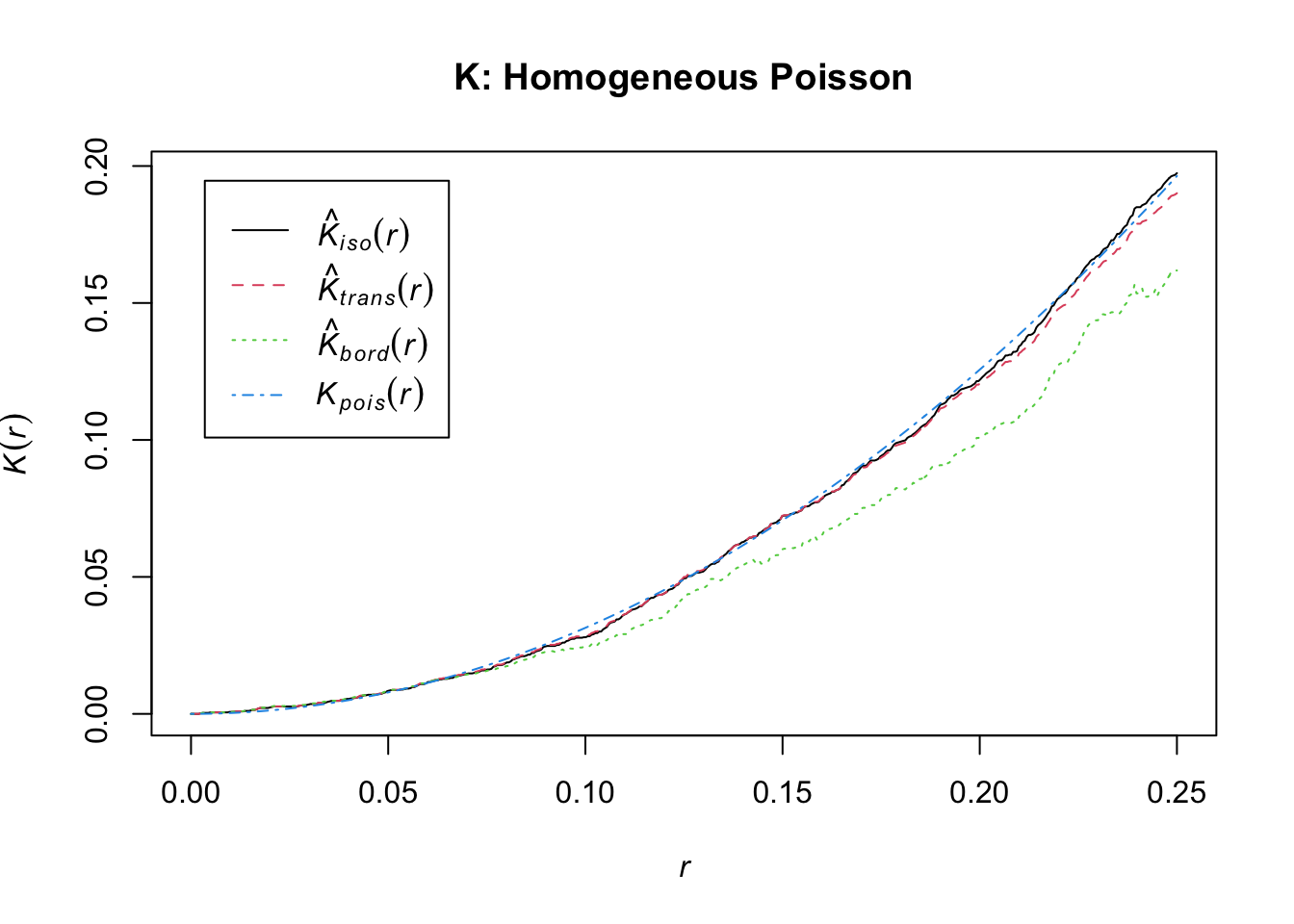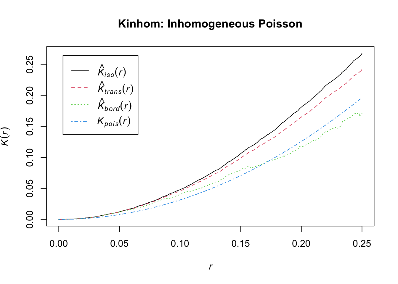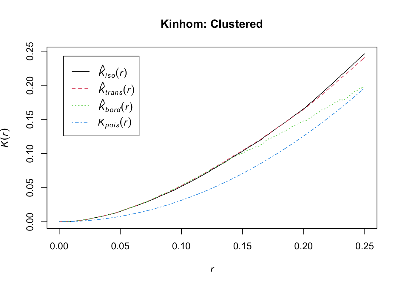 Finally, you can use the spatstat::Kest function to generate the Ripley’s K estimates we discussed in class. Try swapping Kest with Kinhom and check out the differences!