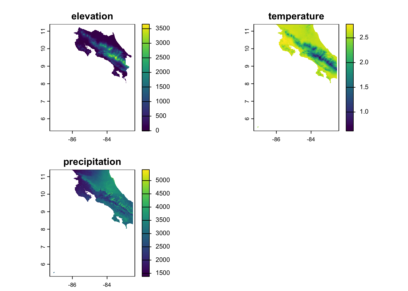 Let’s imagine we’re developing a species distribution model for a species in Costa Rica. We’ll use the elevation data and bioclim variables from the geodata package to give us some spatial predictors. To keep this tractable (for now), we’ll just use the annual mean temp and precip from bioclim. We subset them using the [[]] notation, then resample them to make sure we’ve got everything aligned (you might remember that the elevation data is higher resolution than the climate data). We also use raster math to convert the temperature to Celsius (see the geodata help for why this is). Finally, we combine the data into one stack and plot each dataset to make sure we’ve got what we expected.