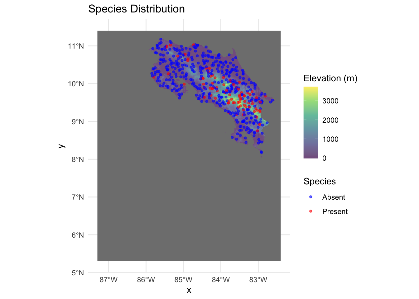 set.seed(123)n_points <-500# Sample random locations from the study areasample_points <-spatSample(elevation, size = n_points, method ="random", na.rm =TRUE, xy =TRUE, values =FALSE)# Extract environmental values at these pointsenv_values <- terra::extract(predictors, sample_points)species_data <-tibble(x = sample_points[,1],y = sample_points[,2],elevation = env_values$elevation,temperature = env_values$temperature,precipitation = env_values$precipitation) %>%drop_na() # Remove any NA values