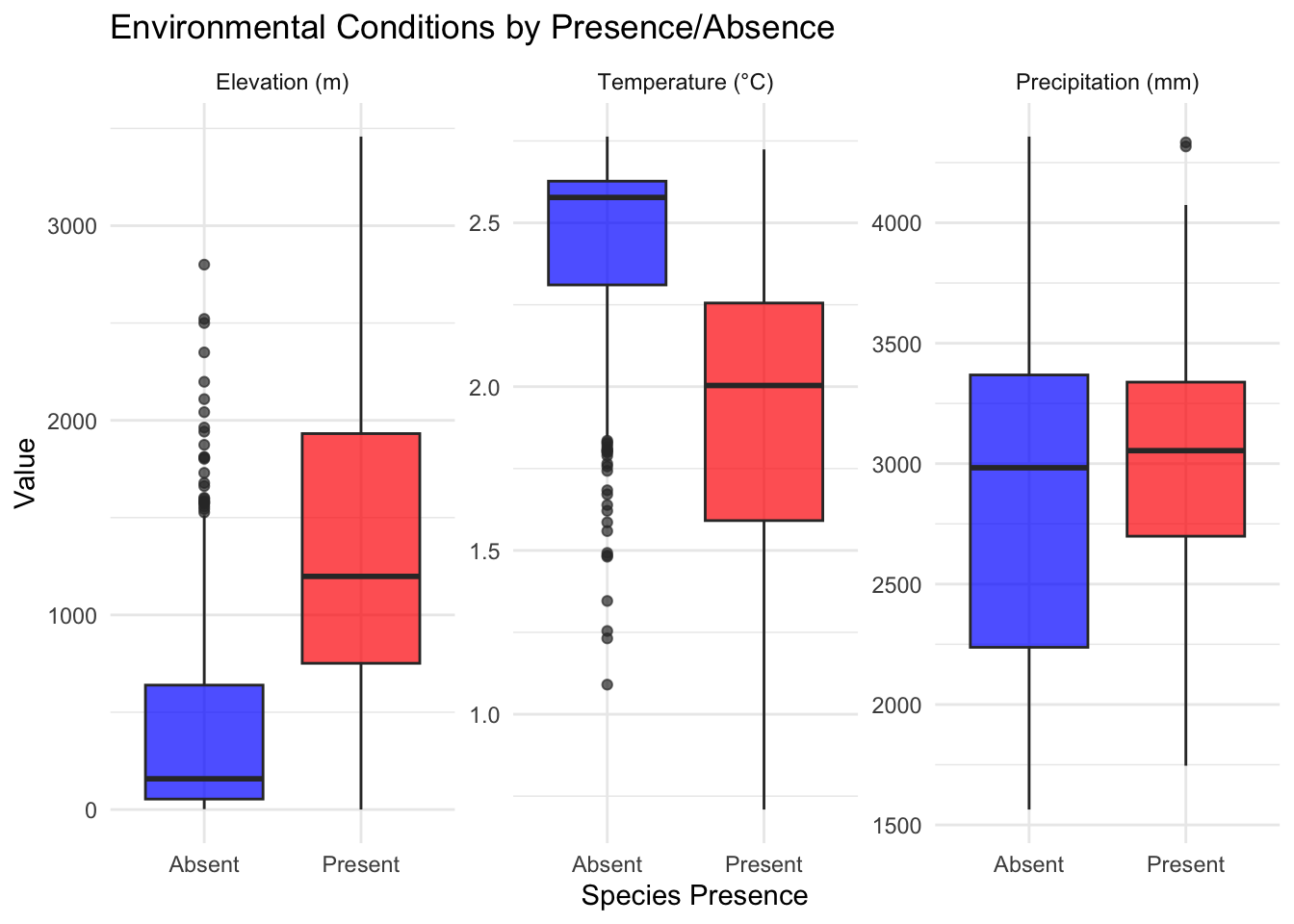model <-glm(presence ~ elevation + temperature + precipitation,data = species_data,family =binomial(link ="logit"))# Model summarysummary(model)